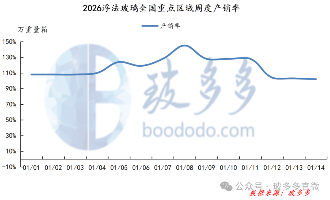 本周截至1月14日■▼▽,浮法玻璃全国重点区域产销率为102%,周内产销率最高为128%,最低为102%。